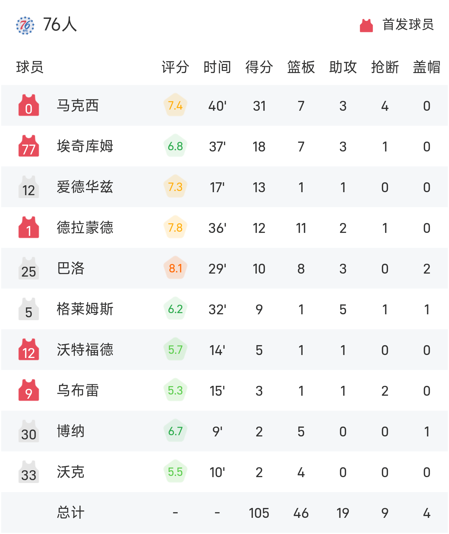 NBA杯战报:詹金斯19分8助,活塞114-105击败76人
